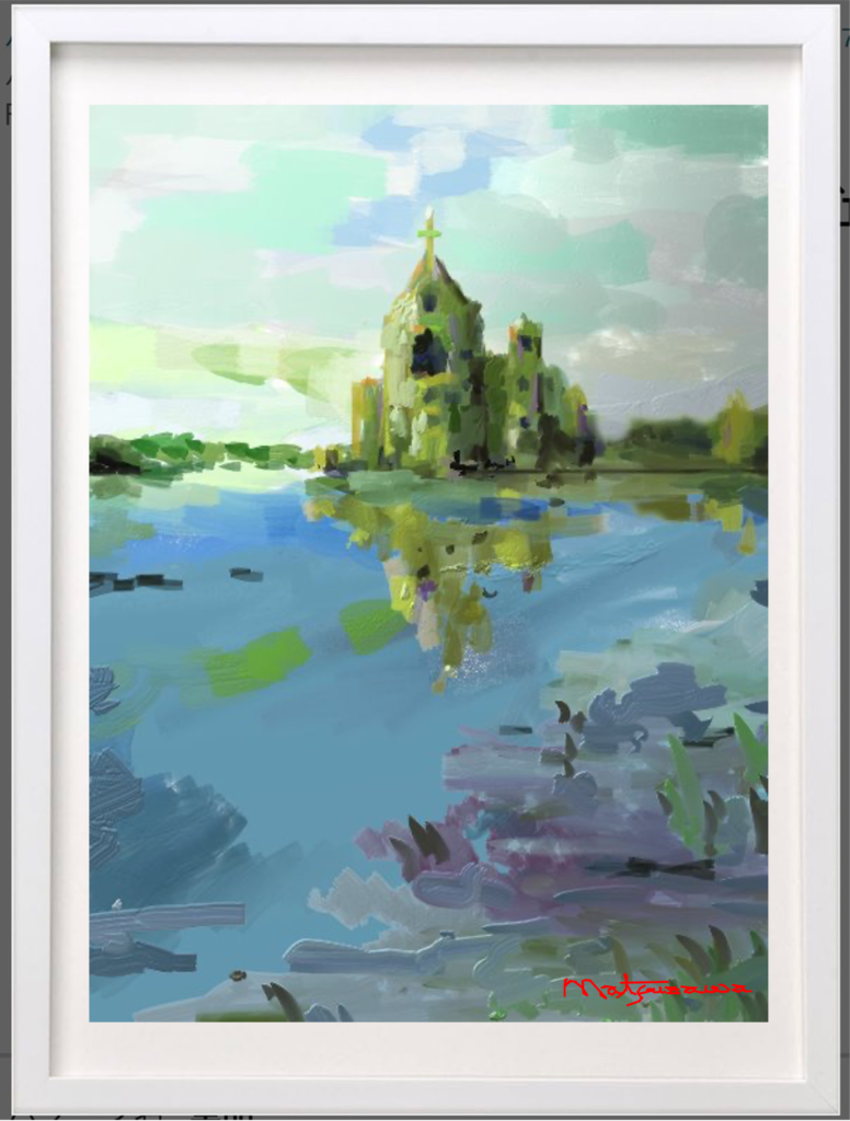 汽水域で湖畔の浅瀬で藻草が生えている様子を描きたかった。アクセントとして向こうに森があり、人が集う古い教会を置き、建物の描写を練習。